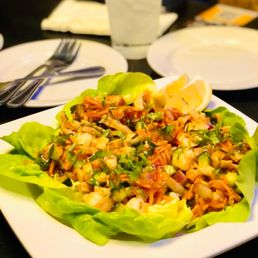 Service was amazing. Food was super tasty, we had the happy hour Thai chicken, lettuce, wraps, and shrimp three ways ,will definitely be going back!